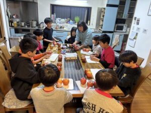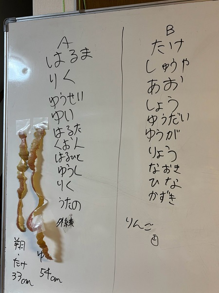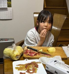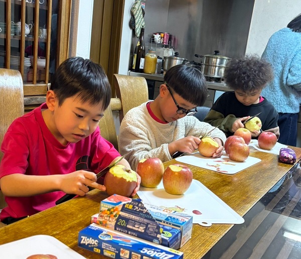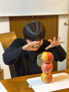 りんごの皮むき 2025.03.15 2025.3.11 みんなで りんごの皮むきの練習をしました 集中(笑) ちょっと試食(笑) 神の手(笑) りんご 皮の長さ 選手権 なんで こんなところに 貼ってるの?(笑)