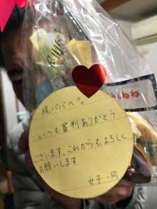 バレンタイン 2019.03.04 遅い投稿 申し訳ありません H31.2.15 一日遅れのバレンタイン 女の子たちが 各自 作った 手作りお菓子に メッセージを添えて~ ♪まるままも いただきましたよー 毎日のコーヒータイム 今日は 誰が作ってくれたのを いただこうかなぁ~なんて(笑) 男子部員たち ウハウハ それ以上に おやじ~ずたちが ウハウハ 顔 隠してるが 写ってる顔 ちょい出し顔 全部出し スマイル全開顔 全部出し ガッツポーズ付き