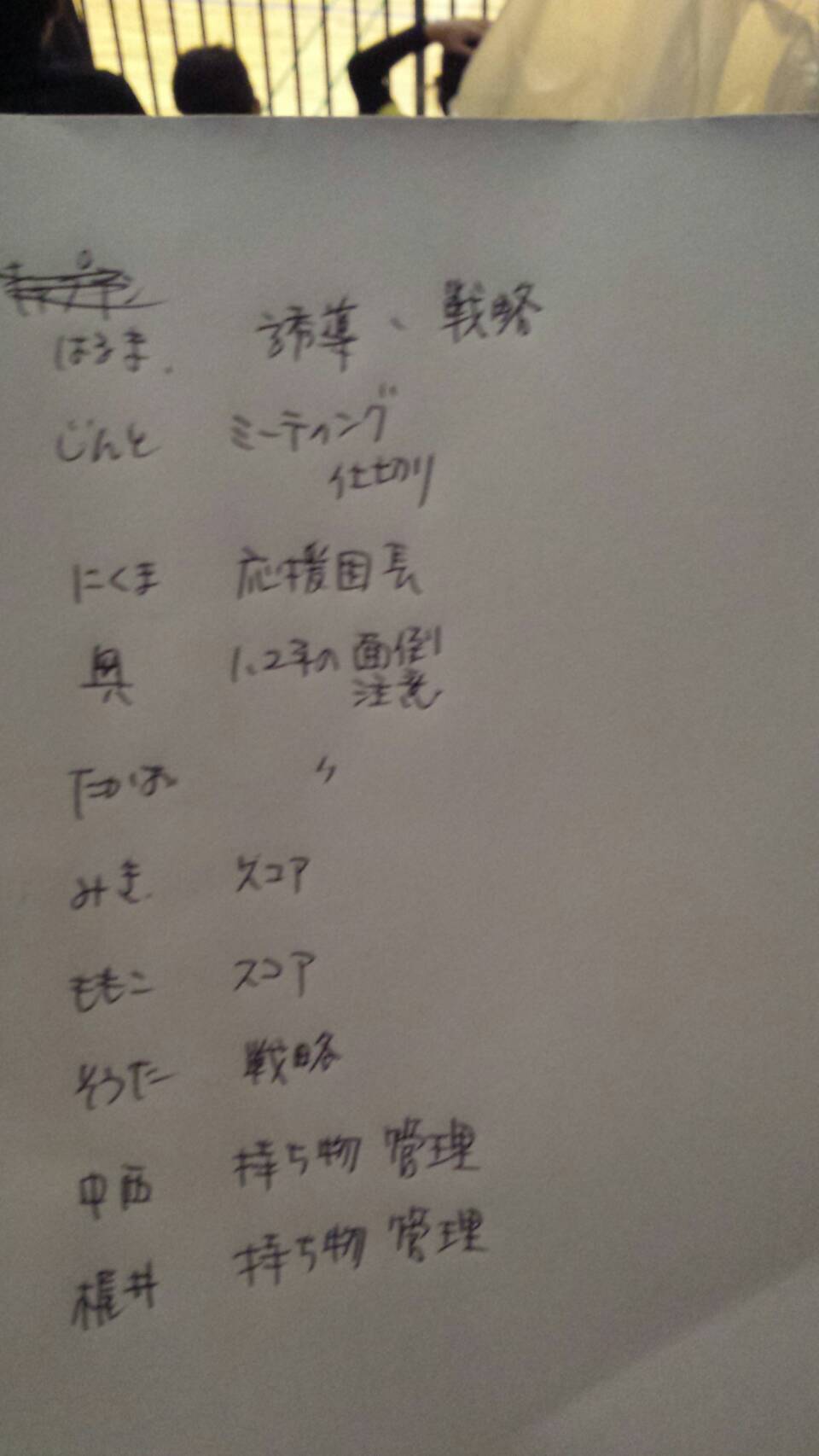 バンビカップ 5.6年の役割分担 2017.11.29 H29.11.25 田原本体育館にて バンビカップ 4年生以下の大会 カワイイ 横断幕ですねぇ(^o^) ジュニアちゃんたち もちろん 頑張ってくれましたが 5.6年も 頑張りましたよ! 役割分担表誘導 戦略 ミーティング 仕切り 応援団長 1.2年の面倒を見る 注意する スコア記入 持ち物管理 なんか スゴイな! ジュニアちゃんのため のようでいて 5.6年が試されてる気が しないでも ないけど・・・(苦笑)