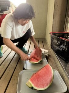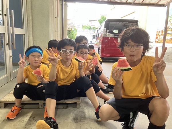 夏 暑い中 練習 頑張ってます! 2024.08.06 2024年7月 練習風景 恒例 百マス 全部 埋まったら 向こうの壁まで走ってタイムを競います 計算力と ダッシュ力 両方必要! OBOGがたくさん来てくれました 本当にありがたい😍 保護者より スイカの差入れ 子供たち 嬉しそう😍