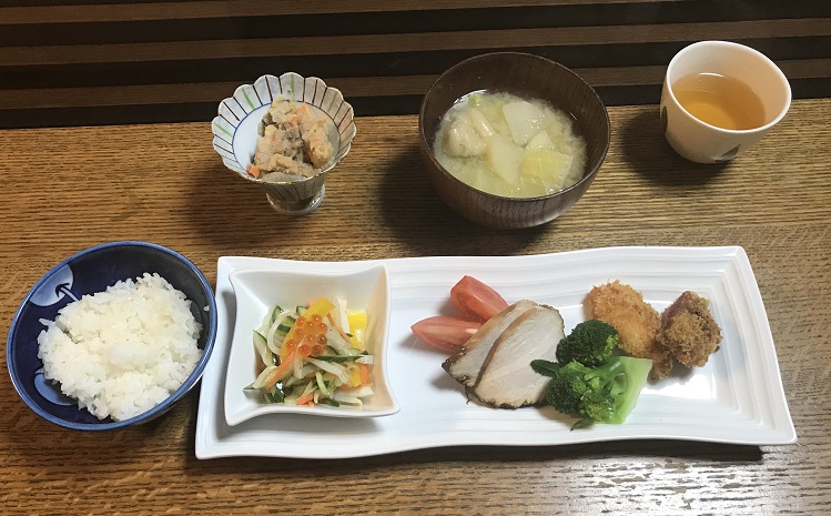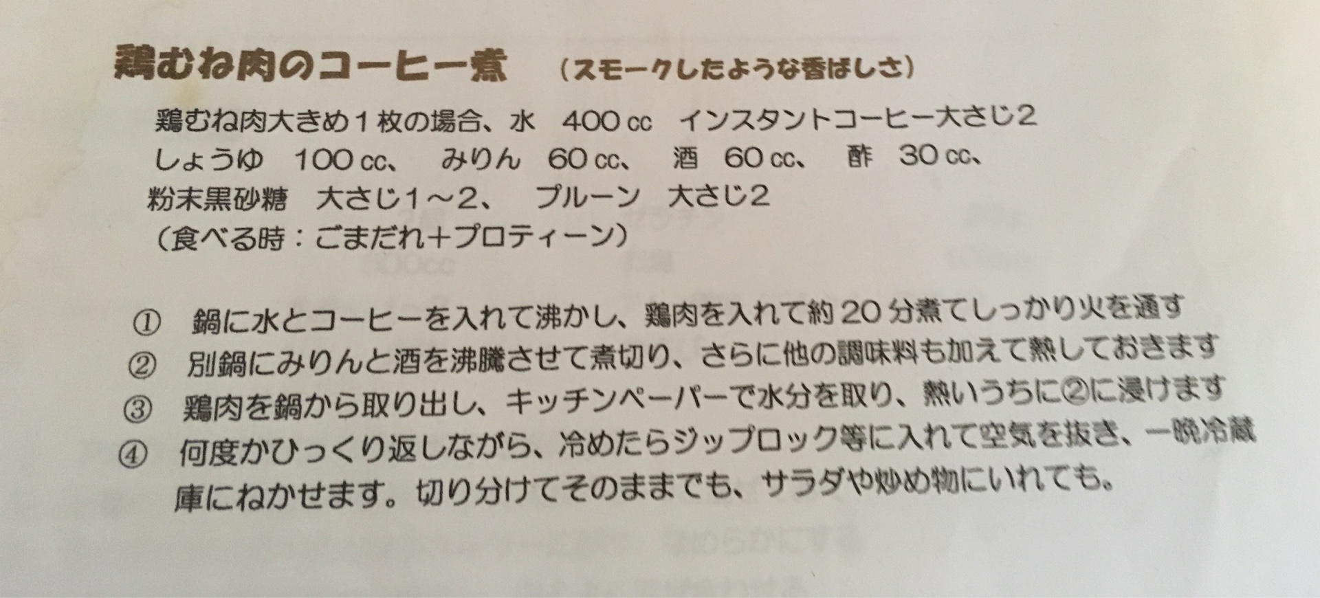 森内家の食卓 VoL.82 2018.03.08 役員引き継ぎ会で ランチをしましたので 久々に~ H30.3.5 森内家の食卓 ★鹿カツ ★鰆のフライ ★鶏むね肉のコーヒー煮 ★イカのマリネ (きゅうり、もやし、パプリカ、たまねぎ、人参、イカ、イクラ) ★付け合わせ (ブロッコリー、トマト) ★おから ★プロテイン団子の味噌汁 (プロテインと片栗粉の団子 小芋、人参、大根、白菜、しいたけ) 【鶏むね肉のコーヒー煮】