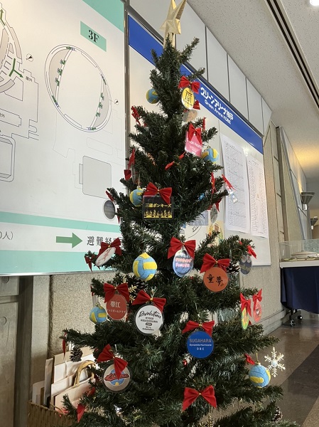 クリスマスツリーにはチームのロゴが飾られていました。