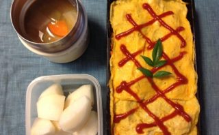 H26.10.10 森内家のお弁当オムライスです~味噌汁(人参、玉ねぎ、キャベツ)梨