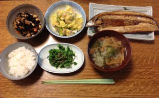 森内家の食卓 森内家の食卓 VoL.64 H25.8.31 森内家の食卓です新物のサンマが出たね!・北海道産のサンマ・ひじきと大豆の煮物・ポテトサラダ・間引き菜のお浸し・わかめとなめこの味噌汁 2013.09.06 森内家の食卓