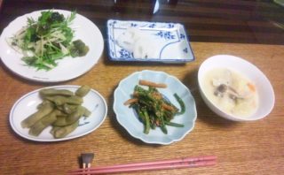 鮭とホタテのクリームシチュー / 水菜と洋梨のサラダ / いんげん豆と人参のきんぴら / 剣先イカのお刺身 / 枝豆