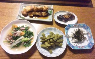 焼き鳥 / イカと野菜・きのこのうま煮 / 枝豆 / 長芋と海苔のわさびしょうゆ / ナスの漬け物